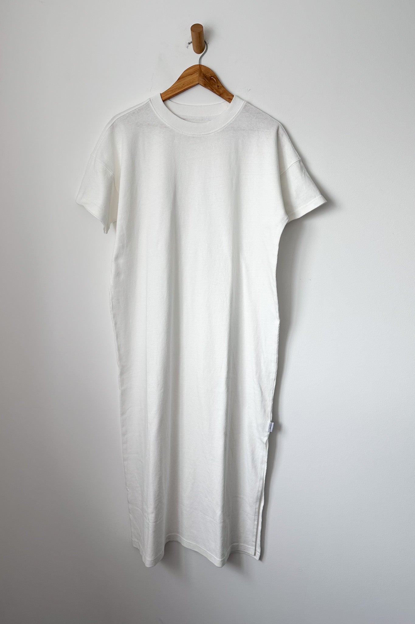 The perfectly oversized t-shirt dress modeled after our iconic Her Tee. It maintains a relaxed fit and features a side slit and boxy, oversized shoulders. Roll the sleeves for a refined look or leave them undone for an effortless vibe. It’s versatile design and fabrication make it a great option for both casual and elevated outings.