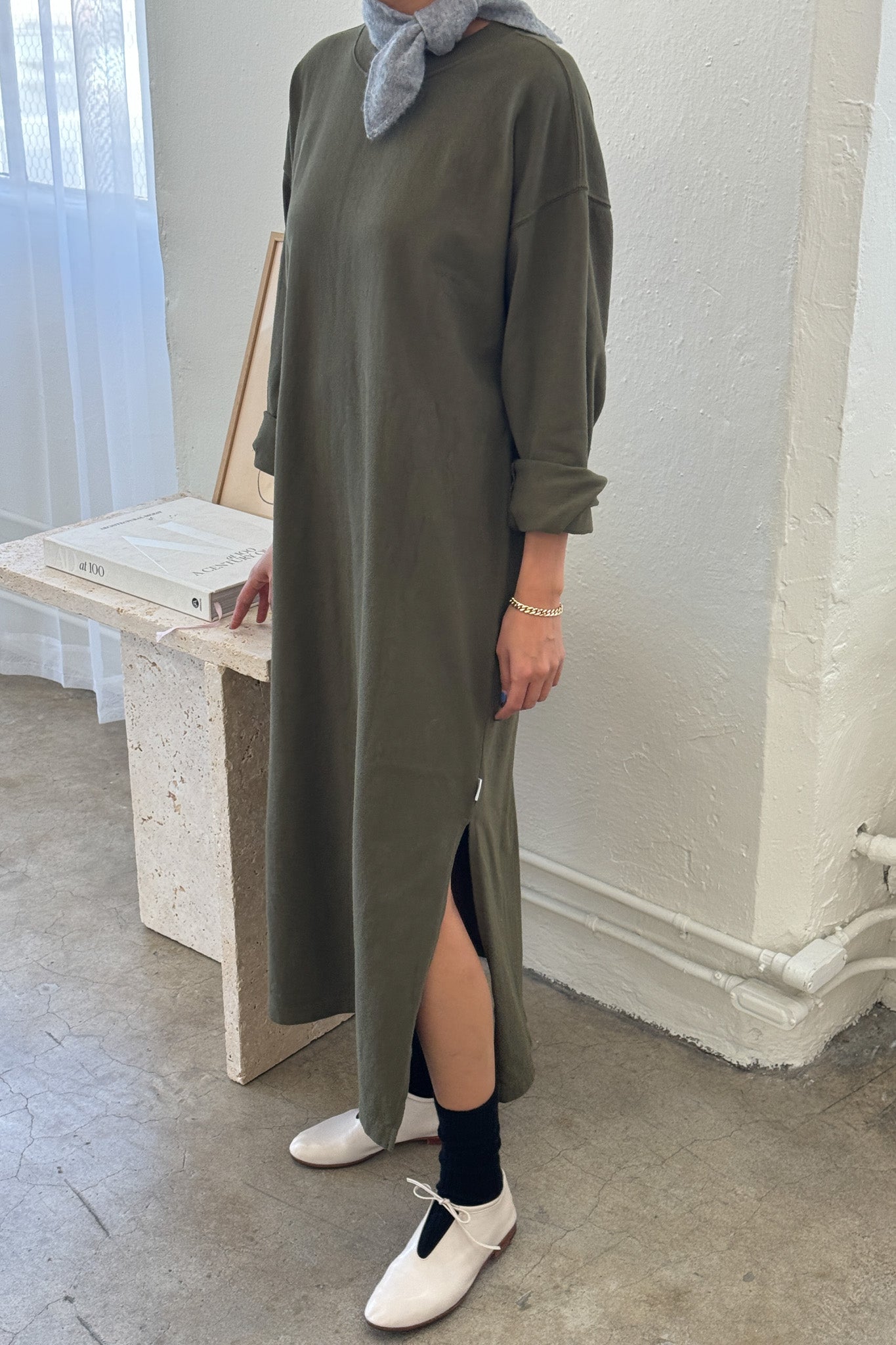 The Sunday Dress pays tribute to our bestselling Sunday Tee and Her Dress, offering the perfect blend of comfort and style. With a menswear-inspired fit and a subtle, playful high side slit, this ankle-length dress effortlessly combines masculine details with feminine flair. The sleeves are wide enough to roll up, making it an easy addition to your wardrobe staples.
