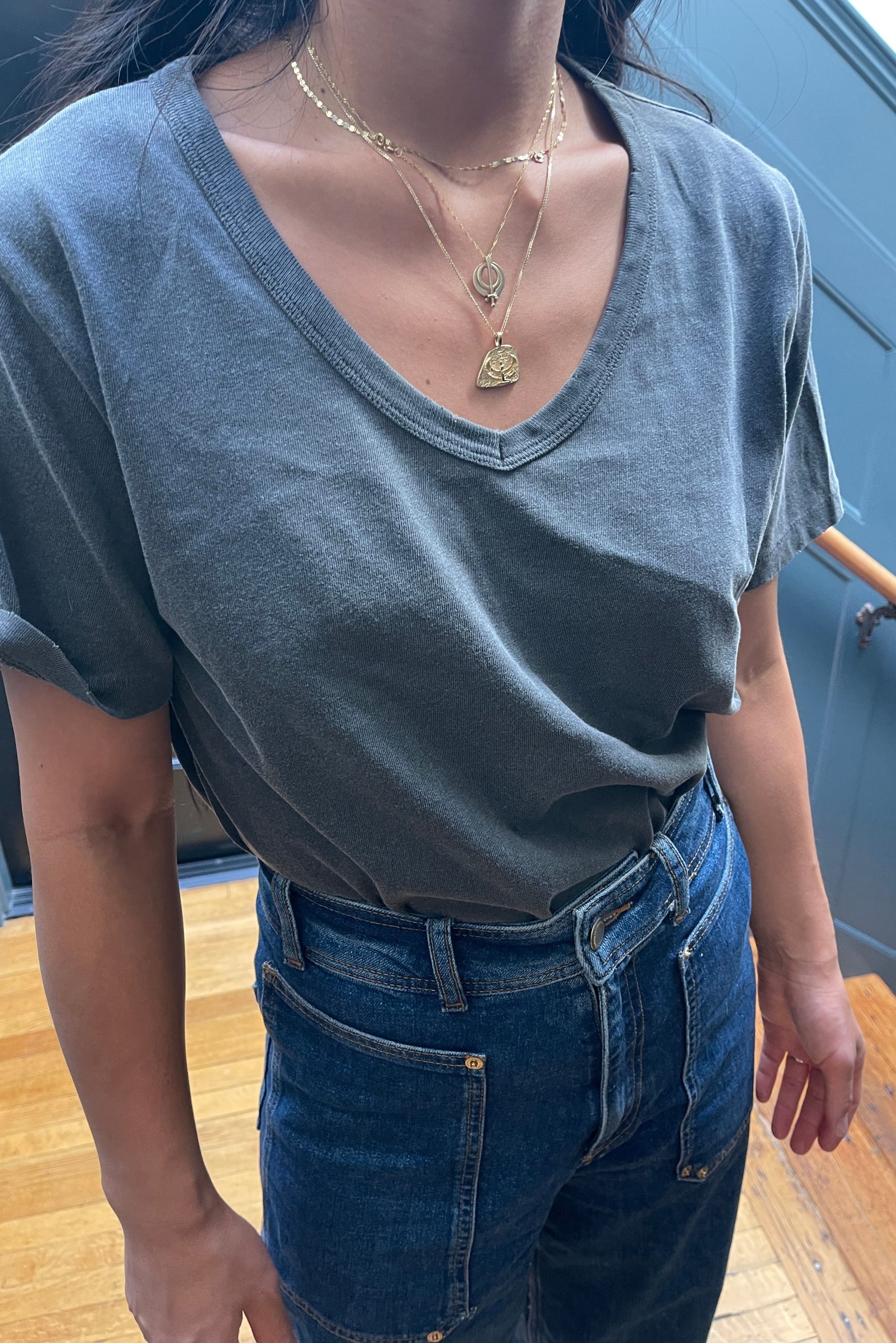 Our classic cut Organic Vintage Boy Tee is now available in the perfect V-neck. For our girls with a heart of gold and a Rock n’ Roll soul, c’est La Vie! It is gently distressed for that charming vintage look and maintains a flattering relaxed fit. Garment dyed and pre-washed, it features a rich texture without being see-through and won’t shrink in the wash!