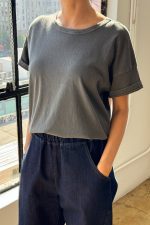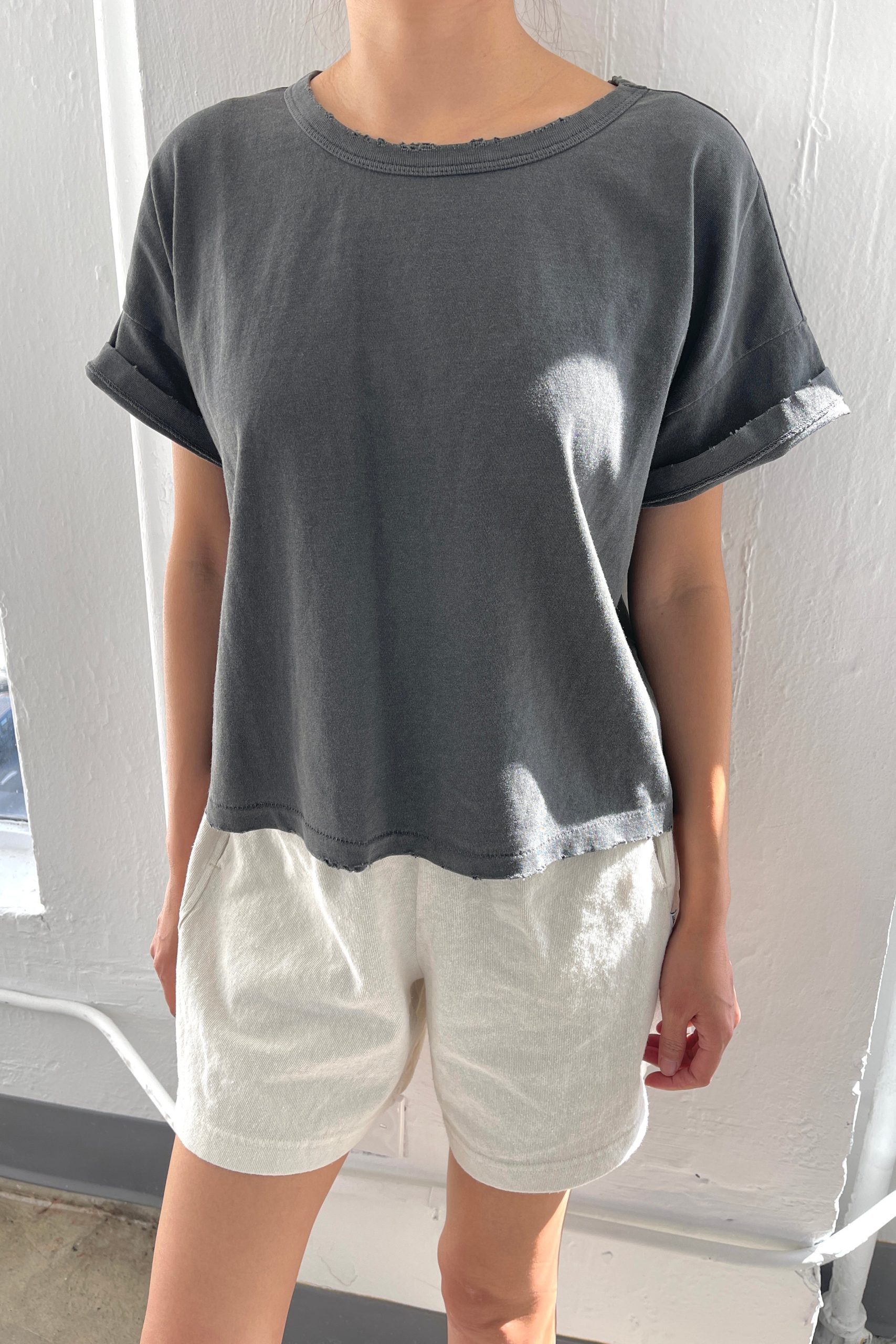 The perfect cropped but not too short tee to pair with all your high waisted bottoms is here to stay. Fille Tee is the exact length that you have been searching for in a shorter tee to wear untucked. With a light vintage distressed detail she will give you that oh so effortless look.